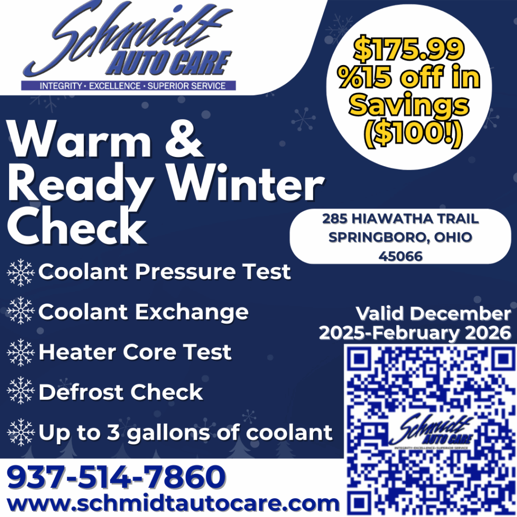 At Schmidt Auto Care, we go beyond fixing cars—we build trust and provide education, keeping your experience stress-free and your vehicle in excellent condition. Founded in 2009, we’re a veteran-owned auto shop with a passion for quality car care. We are proud to be family-run, women-friendly, and deeply committed to our Springboro, OH community.